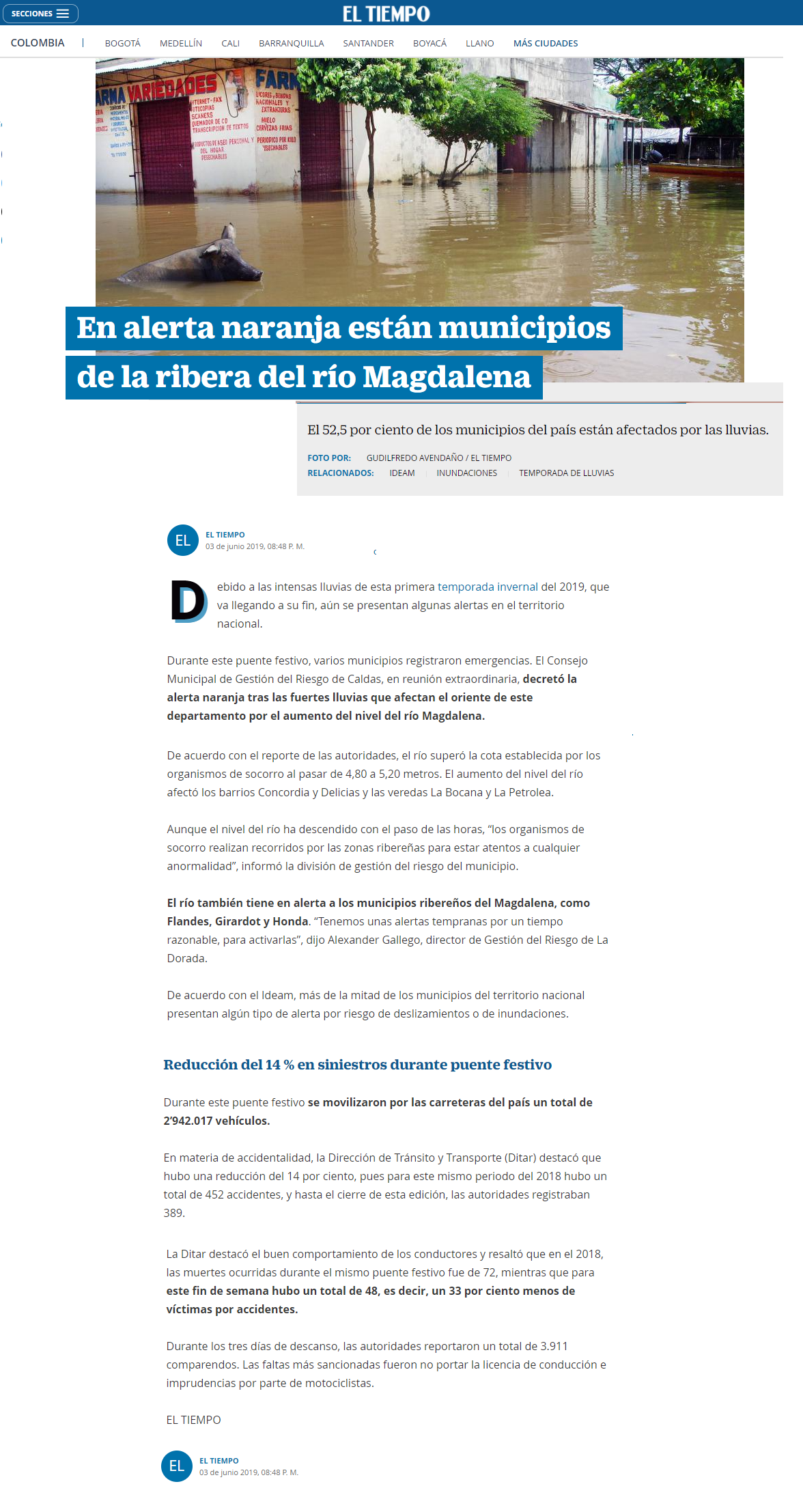 Durante este puente festivo, varios municipios registraron emergencias. El Consejo Municipal de Gestión del Riesgo de Caldas, en reunión extraordinaria, decretó la alerta naranja tras las fuertes lluvias que afectan el oriente de este departamento por el aumento del nivel del río Magdalena. Aunque el nivel del río ha descendido con el paso de las horas, "los organismos de socorro realizan recorridos por las zonas ribereñas para estar atentos a cualquier anormalidad", informó la división de gestión del riesgo del municipio.